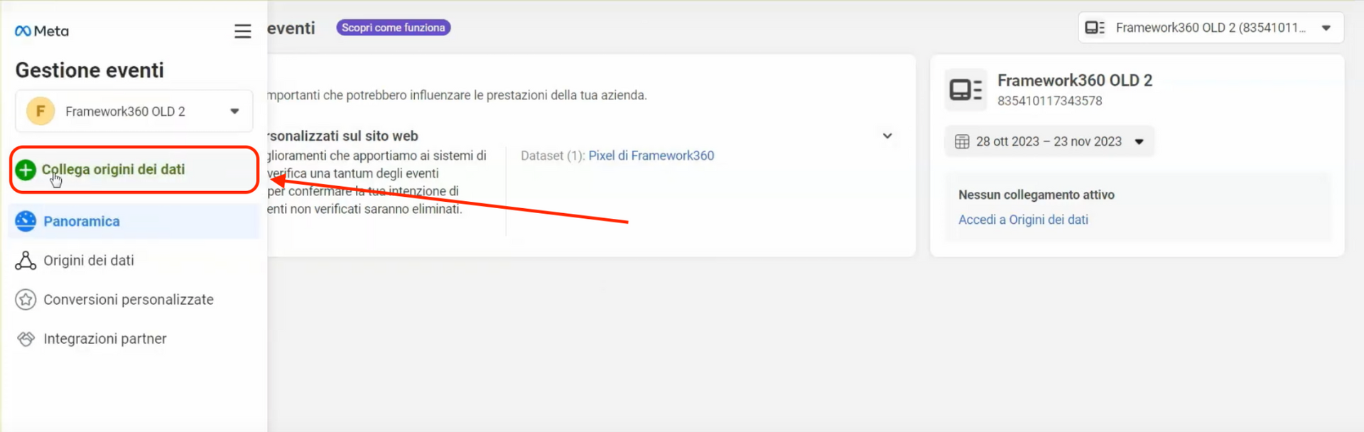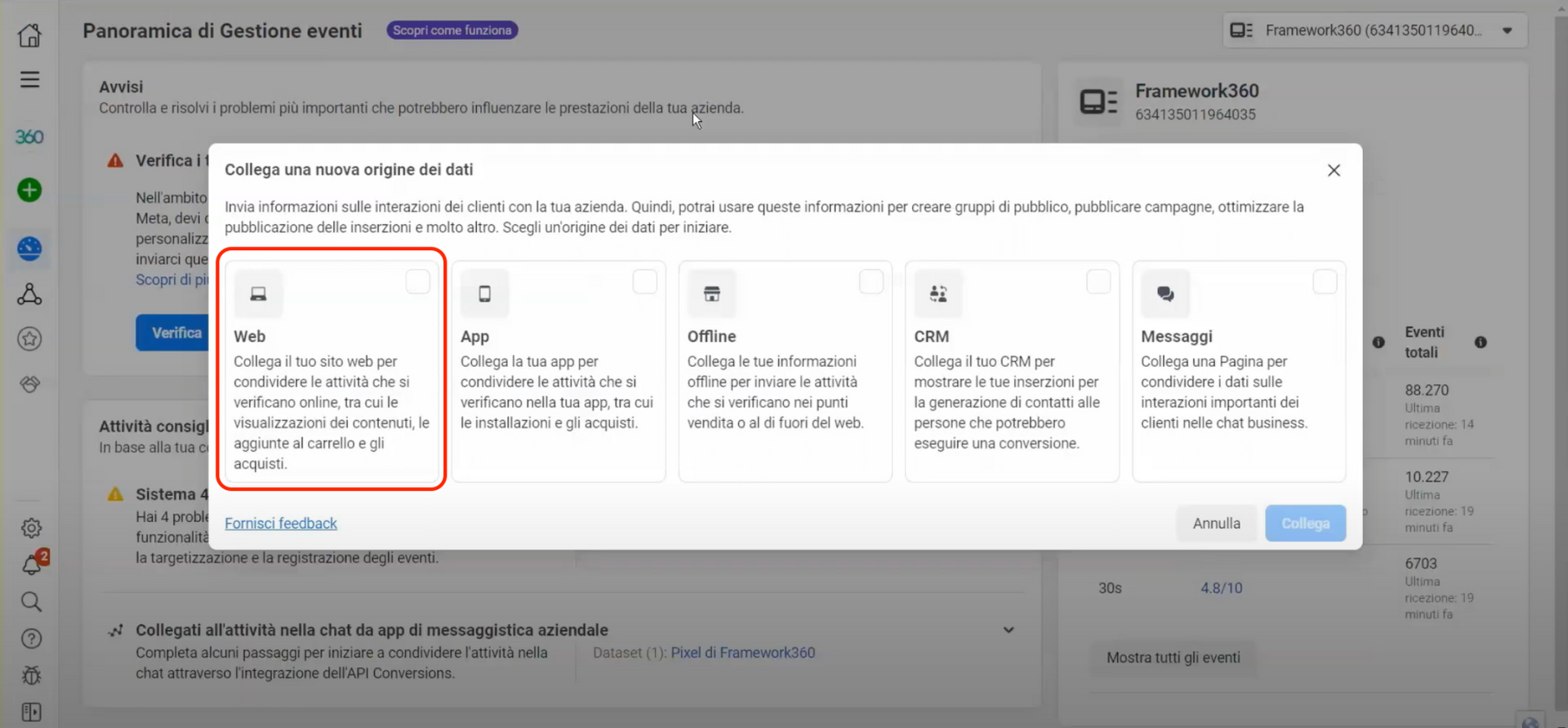 All’interno della schermata “Gestioni eventi” nel menù a sinistra troveremo la voce “Collega origini dei dati”, clicchiamo su detta voce e selezioniamo tra le vari opzioni disponibili l’opzione “Web”.