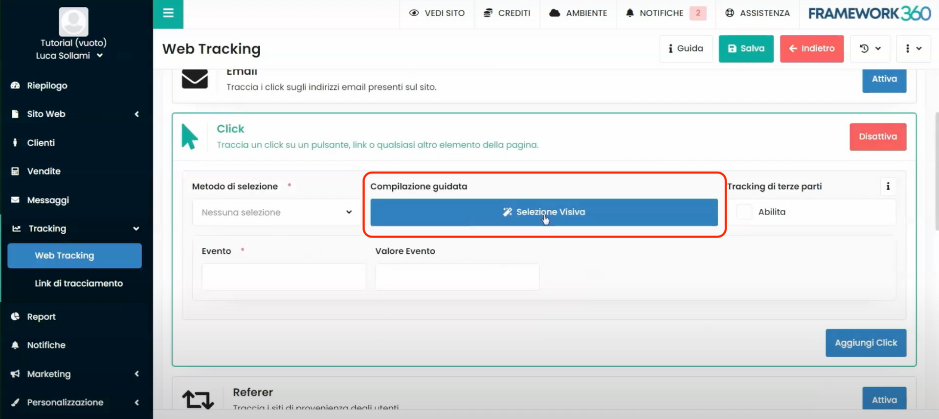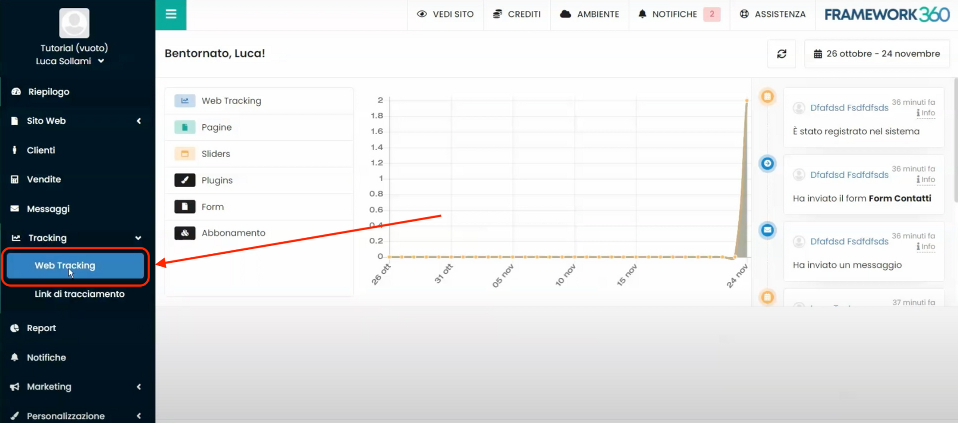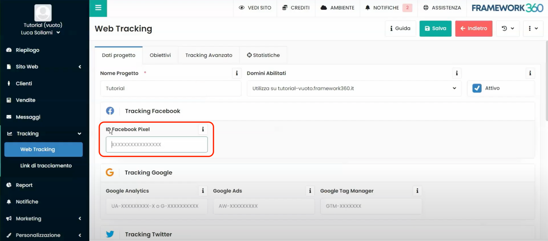 Una volta copiato l’ID accediamo al backoffice del nostro sito web costruito su Framework360 e clicchiamo sulla sottovoce del menù principale “Web Tracking”: