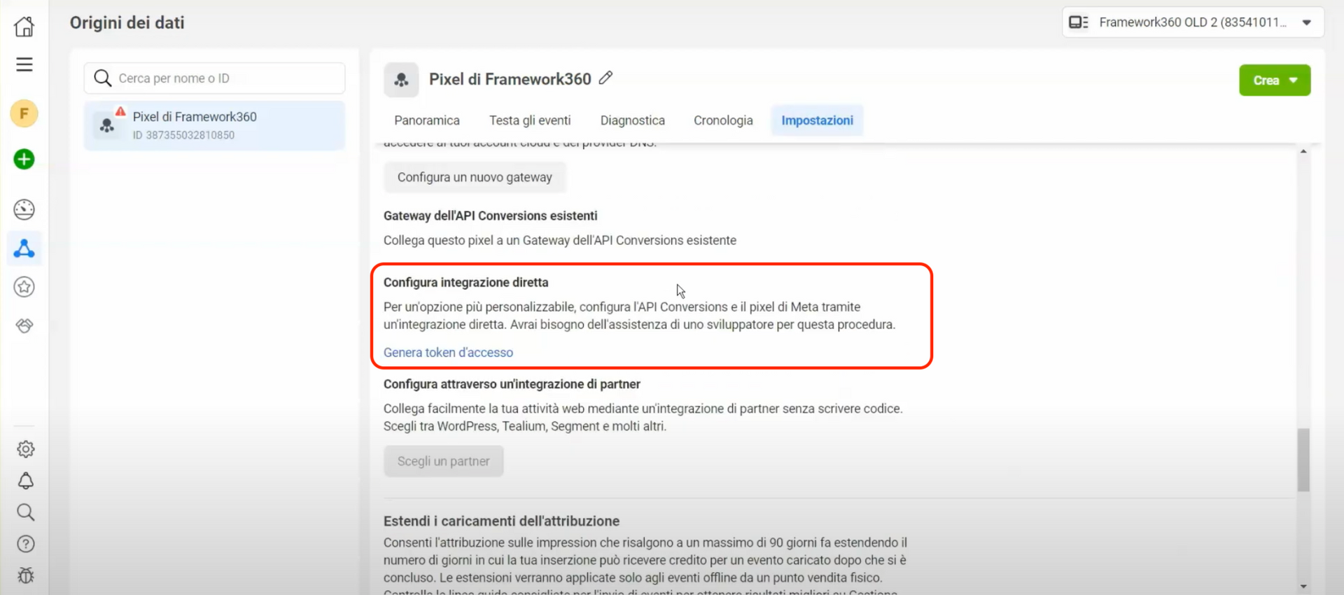 Per poter generare il token di accesso torniamo su Facebook nel tab “Impostazioni” della schermata di riepilogo del Pixel (dove abbiamo preso il codice ID) alla voce “Configura integrazione diretta” e clicchiamo sul pulsante “Genera token d’accesso”, come mostrato nell’immagine successiva: