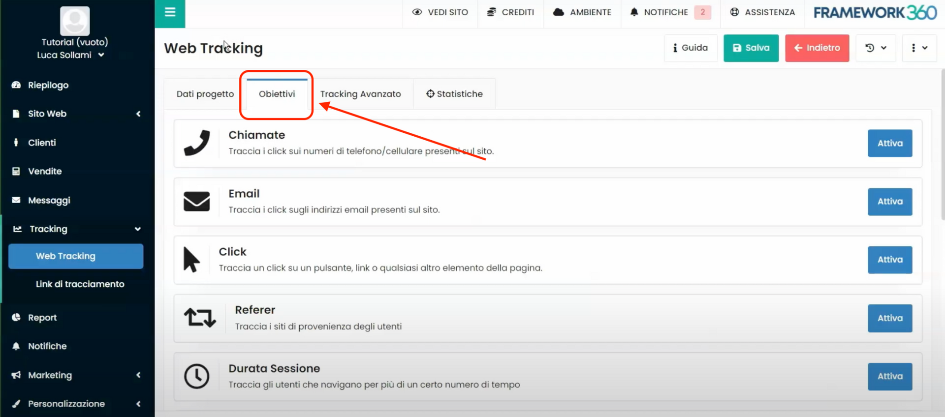 Per prima cosa rechiamoci sul tab “Obbiettivi” della schermata di modifica di Framework360 del progetto di Tracking.