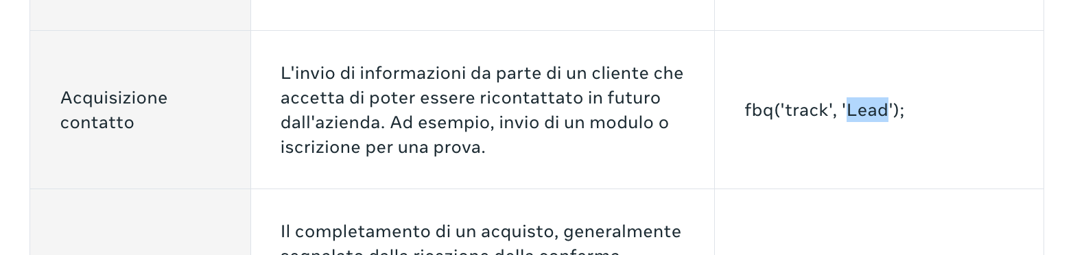 Sulla base di quanto detto pocanzi, nel momento in cui configuriamo un evento, è opportuno verificare se tale evento rientra tra gli eventi standard di Facebook o meno, perché qualora rientrasse tra gli eventi standard, dovremmo procedere alla sua configurazione in maniera differente rispetto a quanto visto nello step 3 inerente alla configurazione di un evento personalizzato. Ad esempio, se volessimo tracciare un click che debba essere considerato come un contatto acquisito, ricercando nella tabella degli eventi standard di Facebook ci accorgeremmo che esso rientra tra tali eventi. Infatti, nella tabella troveremo l'evento “Acquisizione contatto”. Una volta individuato l’evento, copiamo la parola tra le virgolette del codice dell’evento messo a disposizione da Facebook, come mostrato in figura: