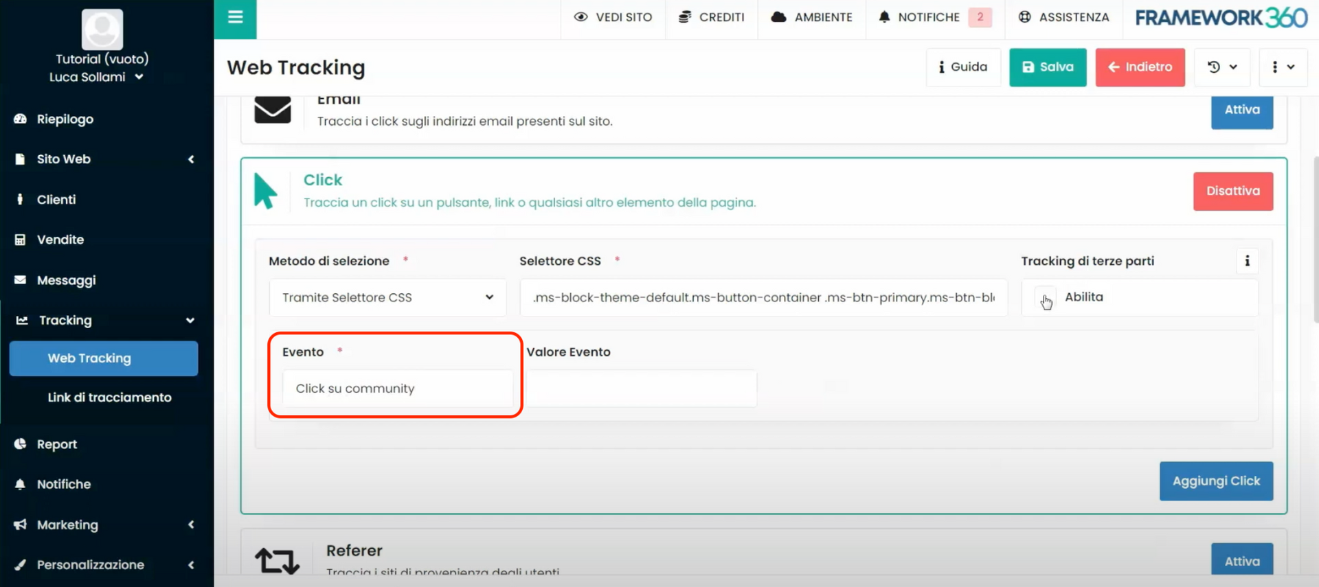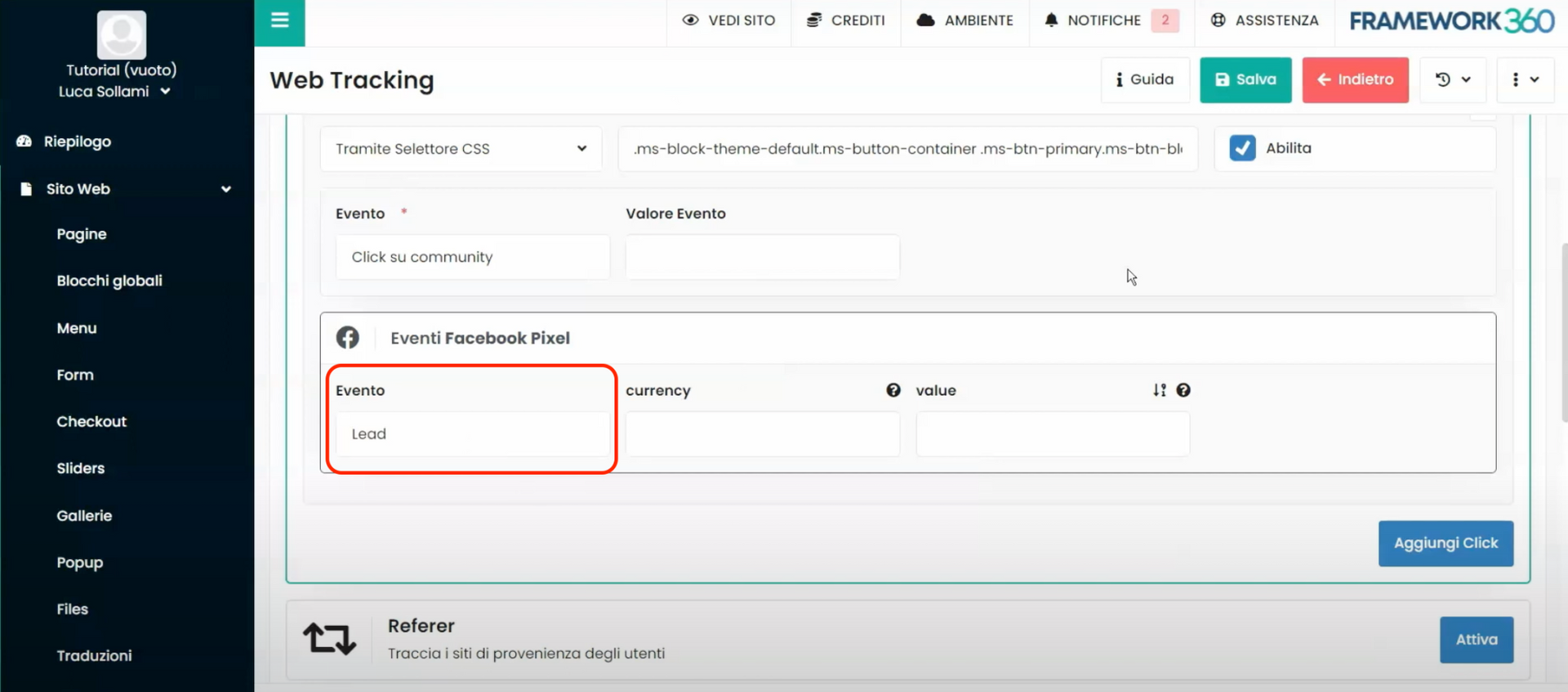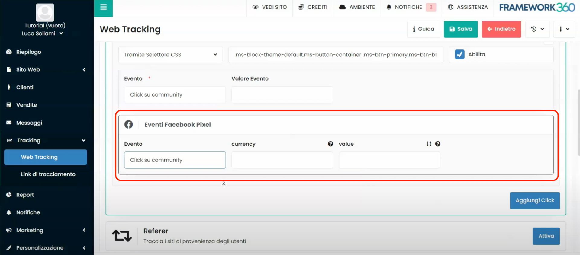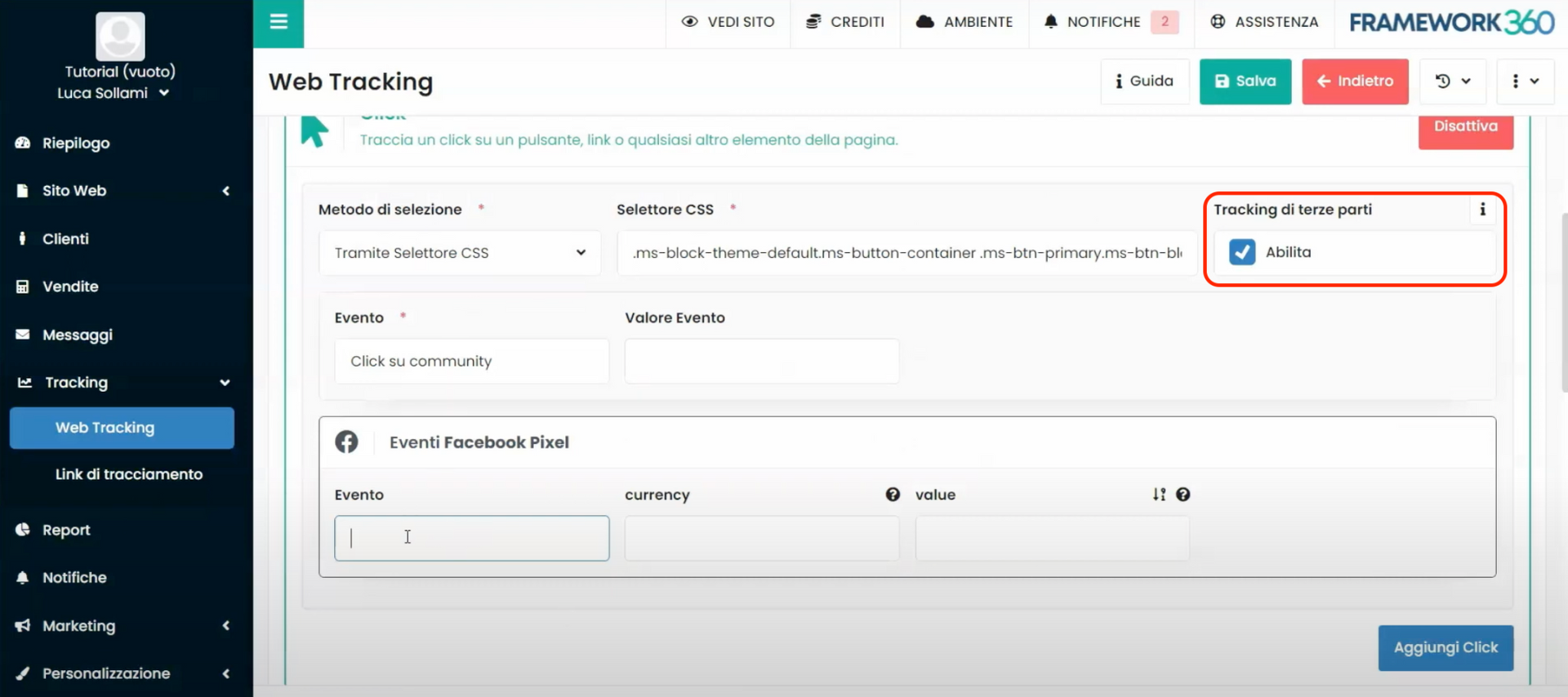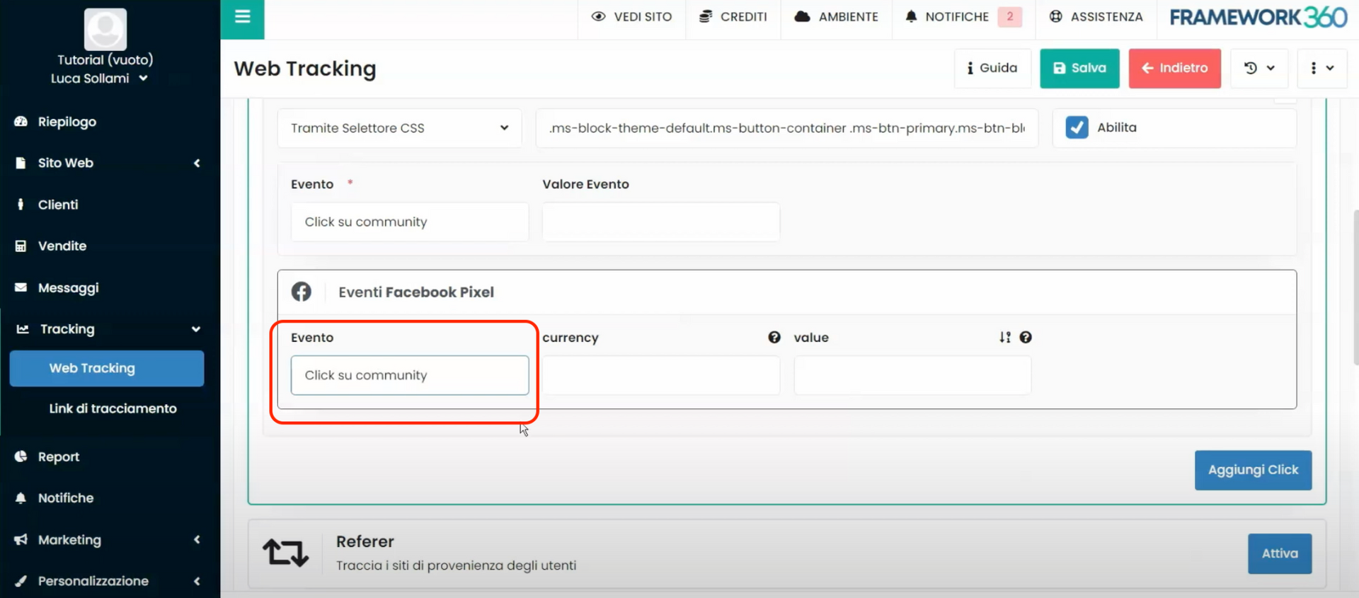 A questo punto ritorniamo su Framework360 e configuriamo l’obbiettivo di click in maniera analoga a quanto visto nello step precedente. Ma in questo caso alla voce “Evento” della sezione “Eventi Facebook Pixel” andiamo ad inserire la parola copiata e non un nome inventato da noi come abbiamo fatto nello step precedente.