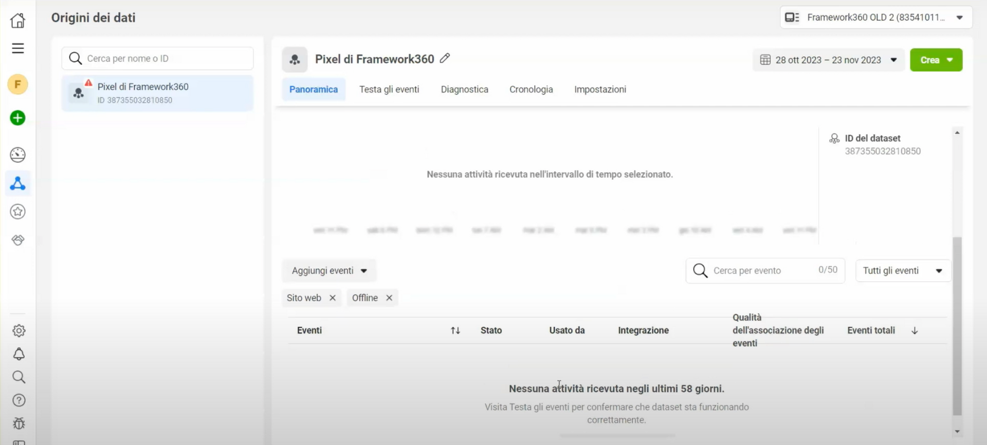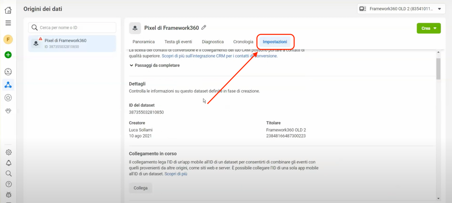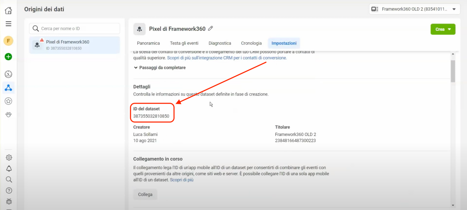 Al primo step abbiamo visto come creare il Pixel di Facebook, alla fine del processo ci siamo ritrovato nella schermata di riepilogo del Pixel. Ora rimanendo all’interno della schermata di riepilogo dobbiamo rechiamoci sul tab “Impostazioni” e copiare il numero presente alla voce “ID del dataset”.