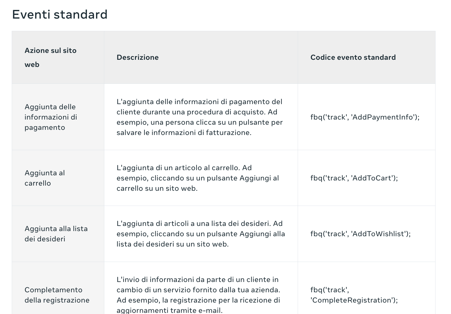Va specificato che l’evento da noi configurato nell’esempio dello step precedente è un evento personalizzato, ovvero, un evento in cui andiamo a definire noi qual è nome da dare all’evento. Facebook, però, ci fornisce degli eventi già preimpostati sulla sua piattaforma chiamati eventi standard. Per poter sapere quali sono gli eventi standard ci basterà ricercare da Google la pagina di Facebook chiamata “Specifiche per gli eventi standard del pixel di Meta”, in tale pagina è presente una lista di tutti gli eventi standard di Facebook con il relativo codice. In questo step andremo a vedere come configurare un evento standard.